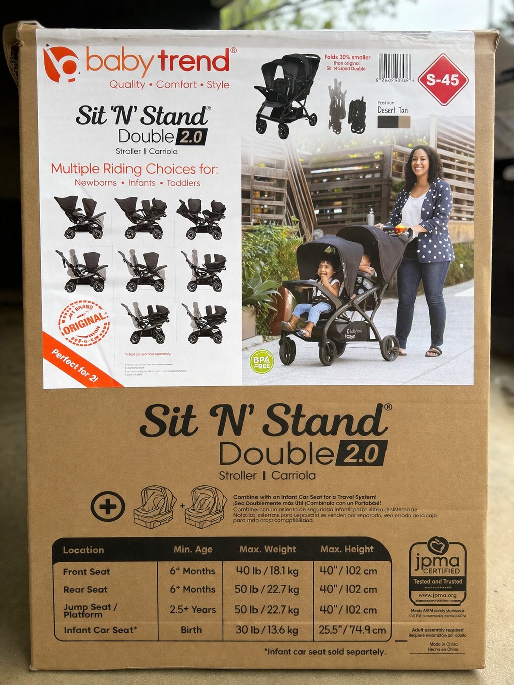 The Baby Trend Sit N' Stand Double 2.0 Stroller in Dash Grey is perfect for growing families. Kids can sit in the front and rear seats or stand on the rear platform — giving you flexible options as your family grows. Compatible with Baby Trend EZ-Lift and Secure-Lift Infant Car Seats. Features a 5-point safety harness, adjustable canopy, 4 cup holders, covered parent tray, and adjustable headrest height. Made with 100% polyester for easy care and durability.