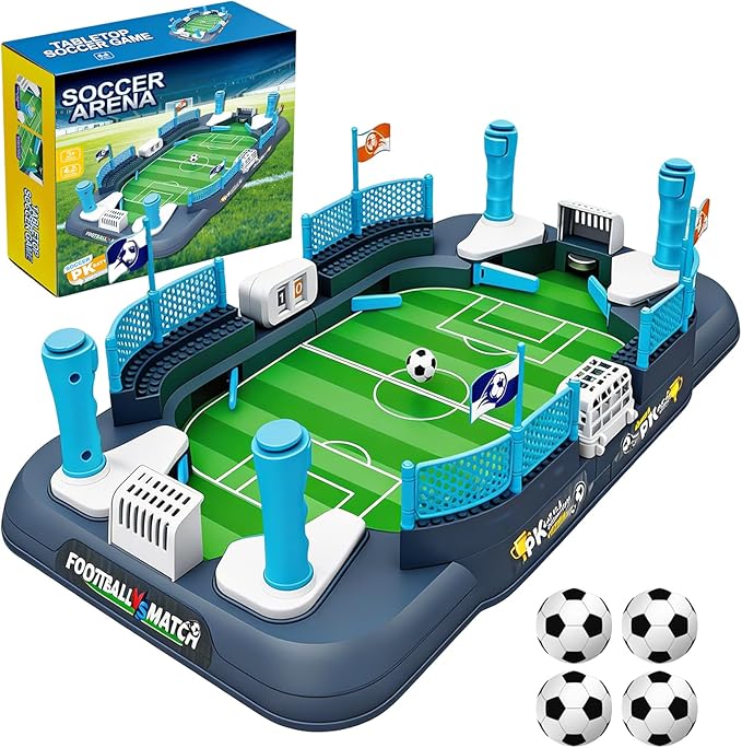 Bring the excitement of soccer right to your tabletop with the Soccer Arena Mini Foosball Game! Each player commands two flipper handles for fast-paced 1-vs-1 soccer duels — perfect for passing, blocking, and powerful shots. Includes 4 soccer balls and a built-in scoreboard. Great for family game nights, rainy days, birthday parties, and playdates. Helps kids develop hand-eye coordination, reflexes, and strategic thinking while having a blast. Made with smooth-edged durable plastic — safe for kids ages 3 and up. The perfect screen-free entertainment for boys and girls ages 6-12 and the whole family!